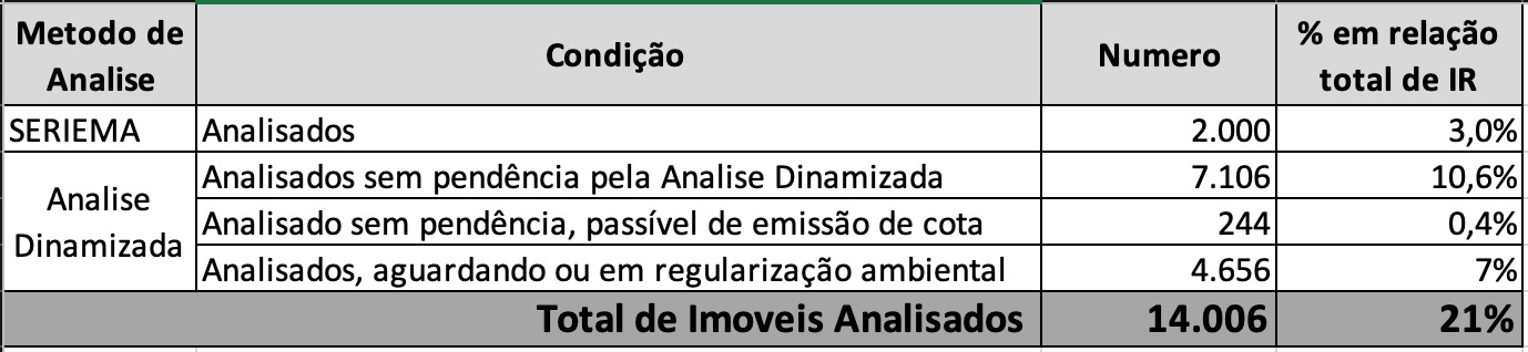 Das sete etapas de implementação do Código Florestal Brasileiro, apenas Mato Grosso do Sul já cumpriu todas. A última é a análise das inscrições no CAR, que vinha sendo feita de forma manual pela equipe de fiscalização atendendo apenas aquelas propriedades com demandas urgentes a serem atendidas. A análise dinamizada é feita por um software comparando as informações fornecidas pelo proprietário do imóvel com o banco de dados do Imasul, numa rapidez muito maior.