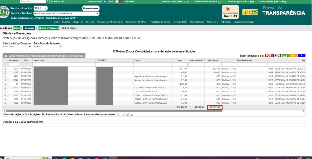 Gastos com diárias chegam a quase R$ 700 mil em onze meses. (Reprodução Portal da Transparência)
