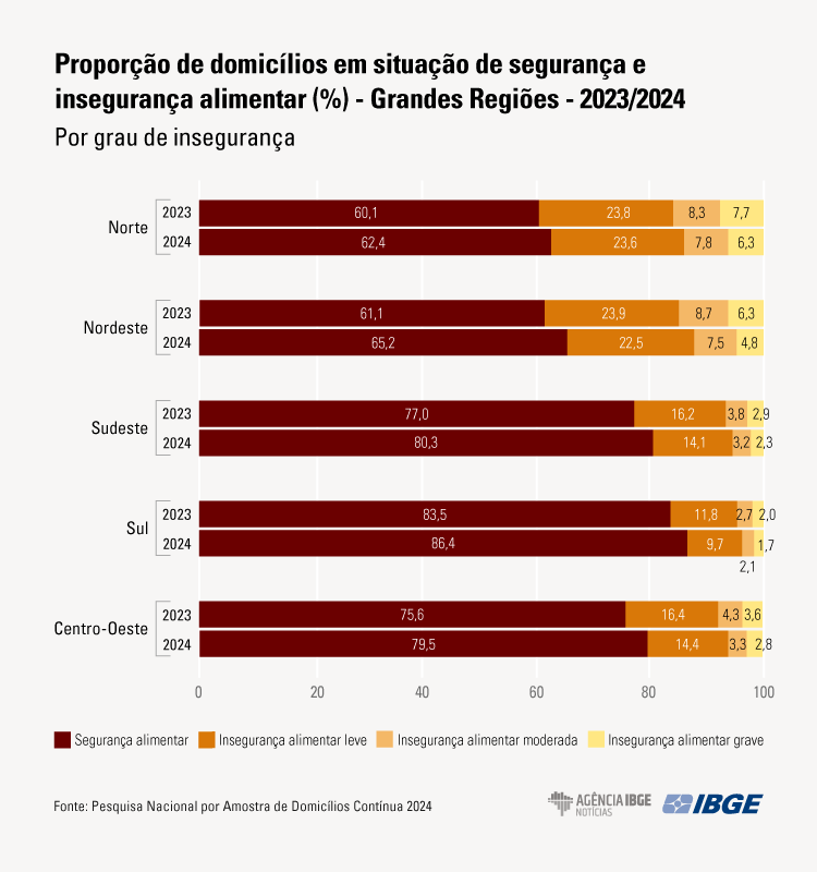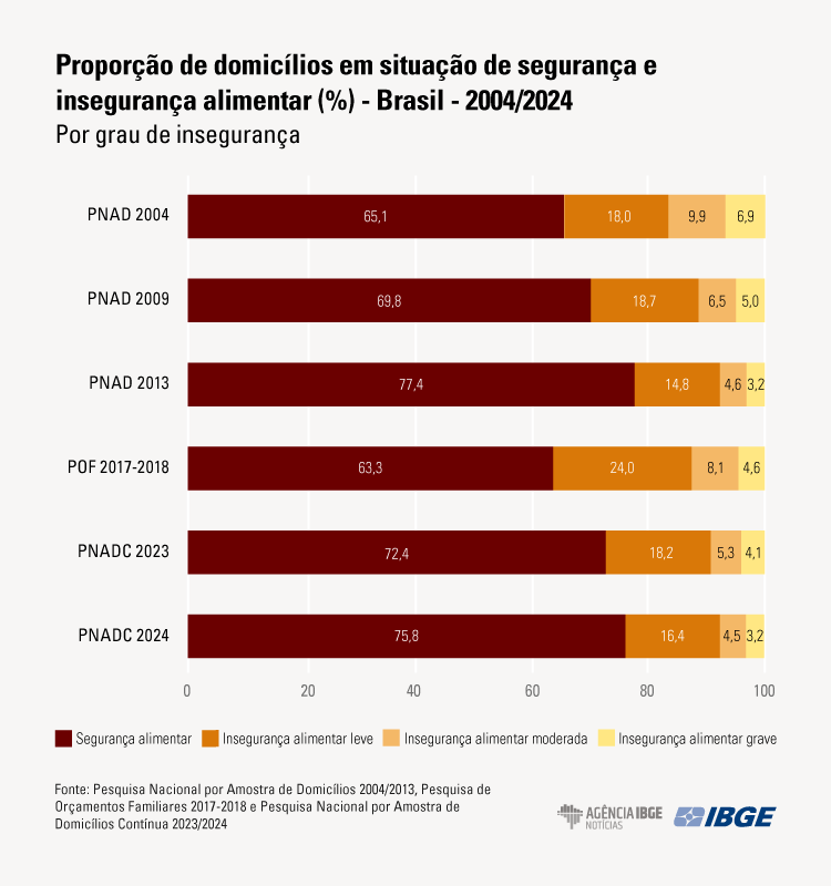 Consequentemente, a proporção de domicílios em segurança alimentar aumentou de 72,4% para 75,8%.