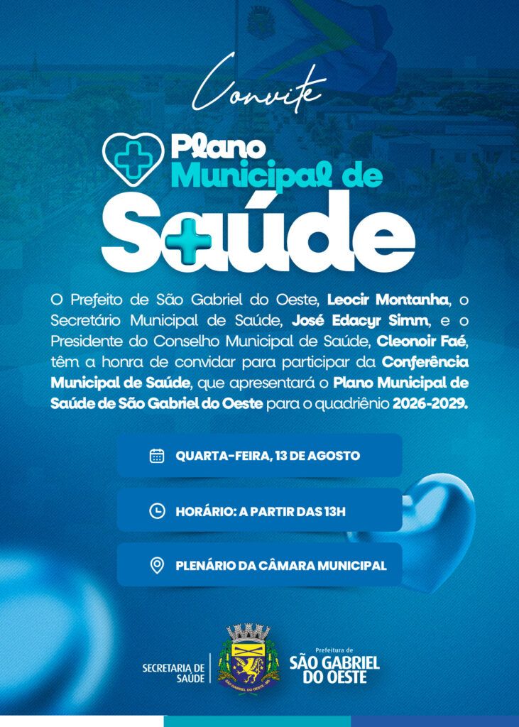 A Prefeitura de São Gabriel do Oeste, por meio da Secretaria Municipal de Saúde, realizará no dia 13 de agosto (quarta-feira), às 13h, no Plenário da Câmara de Vereadores, a Conferência Municipal de Saúde para apresentação oficial do Plano Municipal de Saúde (PMS) 2026-2029.